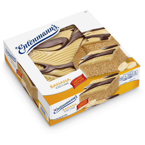 Moist and flavorful banana cake topped with a creamy banana and chocolatey icing. A delicious treat for banana lovers! Since 1898 the Entenmann's name has stood for moist and delicious baked goods. Today, this tradition remains, as Entenmann's bakes fresh and delivers to stores daily. - William Entenmann. Back by popular demand. Everyone's got a favorite! Baked fresh daily. BCTGM: Bakery Confectionary Tobacco Workers & Grain Millers union made. AFL-CIO CLC.
